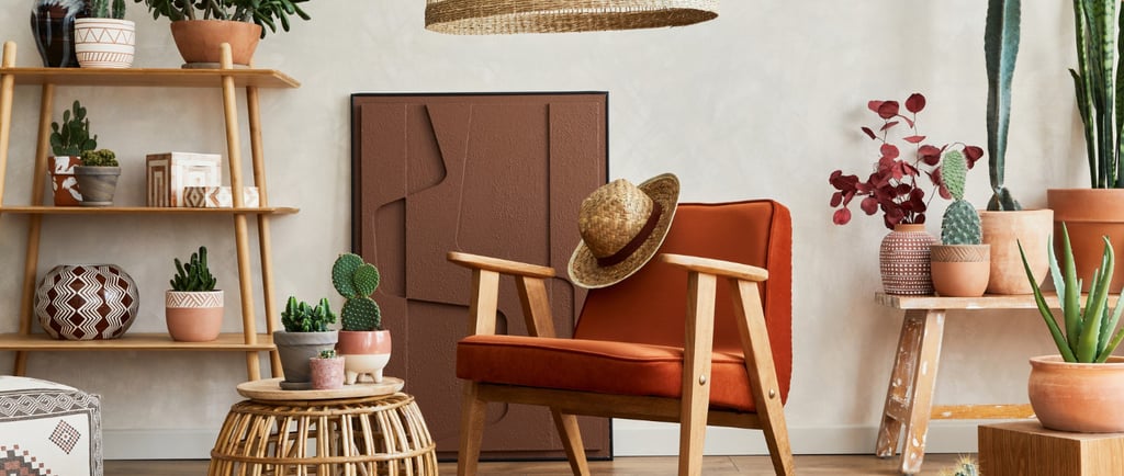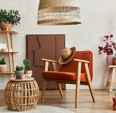 Materiais naturais como madeira, bambu, rattan e cerâmica artesanal.