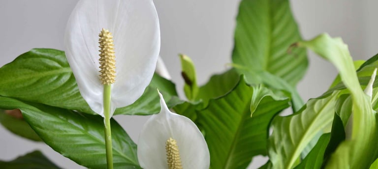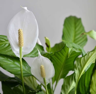 O lírio-da-paz é uma planta elegante, com folhas verdes brilhantes e flores brancas delicadas, ideal para compor espaços sofisticados.